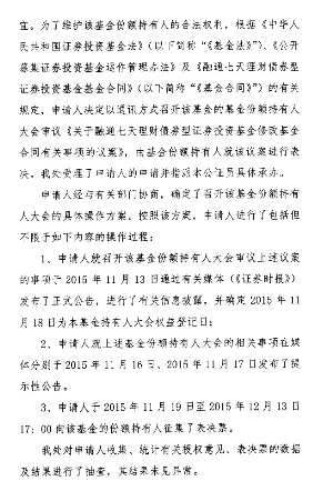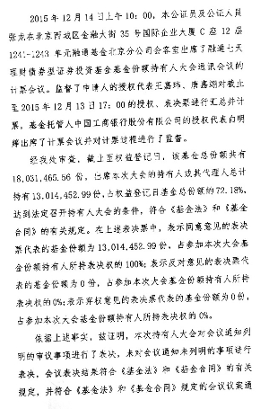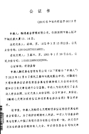 根据《中华人民共和国证券投资基金法》、《公开募集证券投资基金运作管理办法》、《融通七天理财债券型证券投资基金基金合同》(以下简称《基金合同》)的有关约定,现将融通七天理财债券型证券投资基金(以下简称"本基金")基金份额持有人大会的决议及相关事项公告如下: 一、基金份额持有人大会会议情况 融通基金管理有限公司(以下简称"基金管理人"或"本公司")以通讯方式组织召开了融通七天理财债券型证券投资基金基金份额持有人大会,会议投票时间自2015年11月19日起,至2015年12月13日17:00止。会议审议了《关于融通七天理财债券型证券投资基金修改基金合同有关事项的议案》(以下简称"本次会议议案")。 2015 年12月14日,由本基金管理人的授权代表在基金托管人中国工商银行股份有限公司授权代表的监督下进行计票,并由公证机关北京市中信公证处对其计票过程及结果予以公证,上海市通力律师事务所对计票过程及结果进行见证。参加本次大会表决的基金份额持有人(或其代理人)所代表的基金份额共计13,014,452.99份,占权益登记日本基金总份额的72.18%,达到法定开会条件。 本次大会的表决结果为:13,014,452.99份基金份额同意,0份基金份额反对,0份基金份额弃权。同意本次会议议案的基金份额占参加本次大会的持有人所持份额的100%,达到出席本次会议且有表决权的基金份额持有人(或其代理人)所代表表决权的三分之二以上,满足法定生效条件,符合《中华人民共和国证券投资基金法》、《公开募集证券投资基金运作管理办法》和《基金合同》的有关规定,本次会议议案获得通过。 本次基金份额持有人大会费用不列入基金费用,由基金管理人承担。经本基金基金托管人中国工商银行股份有限公司确认,本次基金份额持有人大会费用:律师费5万元,公证费3万元,合计为8万元。 二、基金份额持有人大会决议生效情况 根据《公开募集证券投资基金运作管理办法》的规定,基金份额持有人大会决定的事项自表决通过之日起生效。在实施前预留至少二十个开放日或者交易日供基金份额持有人做出选择。因此,本次基金份额持有人大会决议生效日为 2015 年12月14日,正式实施转型日为 2016年 1 月 18日。 基金管理人将于表决通过之日起 5 日内报中国证监会备案。本次会议通过的表决事项为本公司于2015年11月13日在《证券时报》及本公司网站(www.rtfund.com)刊登的《关于以通讯方式召开融通七天理财债券型证券投资基金基金份额持有人大会的公告》之附件《关于融通七天理财债券型证券投资基金修改基金合同有关事项的议案》。 三、基金份额持有人大会决议相关事项实施情况 1、关于本基金《基金合同》等法律文件的修订情况 根据《关于融通七天理财债券型证券投资基金修改基金合同有关事项的议案》,经与基金托管人协商一致,基金管理人已将《融通七天理财债券型证券投资基金基金合同》、《融通七天理财债券型证券投资基金托管协议》修订为《融通汇财宝货币市场基金基金合同》、《融通汇财宝货币市场基金托管协议》,并据此修订了《融通汇财宝货币市场基金招募说明书》。上述文件已报中国证监会进行变更注册,修订后的文件于2016年1月18日生效,自该日起《融通七天理财债券型证券投资基金基金合同》失效,《融通汇财宝货币市场基金基金合同》生效。 2、转型方案的实施安排 本基金管理人将根据基金份额持有人大会决议执行基金的正式转型,将融通七天理财债券型证券投资基金份额转型为融通汇财宝货币市场基金份额,转型基准日为2016年1月15日。 转型基准日登记在册的原融通七天理财债券型证券投资基金A类份额(代码:161622)和B类份额(代码:161623),基金管理人将为份额持有人计算其持有的基金资产及未结转收益,按照1.00元的面值折算为相应的融通汇财宝货币市场基金A类份额和B类份额,基金代码保持不变。 3、对基金份额持有人的影响和基金份额持有人享有的选择权 本基金转型前为短期理财基金,属于证券投资基金中的较低风险品种,其长期平均风险和预期收益率低于股票基金、混合基金。本基金转型后为货币市场基金,其长期平均风险和预期收益率低于股票基金、混合基金和债券型基金。 转型期间,本基金的申购、赎回业务照常办理,不受影响。 原基金份额持有人在正式实施转型前可选择赎回,未选择赎回的份额持有人,其持有的融通七天理财债券型证券投资基金份额将默认转为相应的融通汇财宝货币市场基金份额。基金的申购赎回业务将照常办理。 四、备查文件 1、《关于以通讯方式召开融通七天理财债券型证券投资基金基金份额持有人大会的公告》; 2、《关于以通讯方式召开融通七天理财债券型证券投资基金基金份额持有人大会的第一次提示性公告》; 3、《关于以通讯方式召开融通七天理财债券型证券投资基金基金份额持有人大会的第二次提示性公告》; 4、上海市通力律师事务所出具的法律意见书; 5、北京市中信公证处出具的公证书。 特此公告。 融通基金管理有限公司 二〇一五年十二月十六日 附件: 北京市中信公证处出具的公证书 ■ ■ ■■