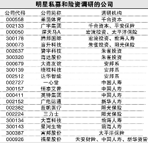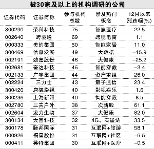 临近年末,机构又开始密集调研上市公司,这既是发掘年末的机会,更是为了布局明年的市场。那么今年机构调研了哪些公司呢? 中小创仍是机构最爱 据Wind数据统计,12月以来,共有235家A股上市公司接受了机构调研,包括沪市主板公司1家,深市主板公司33家,中小板公司121家,创业板公司80家。可见,机构调研仍聚焦于“中小创”。 从参与调研机构的家数来看,有47家公司获得10家以上机构调研,有16家公司被30家以上机构调研,而像美的集团、荣科科技、跨境通这三家公司更是有超过50家机构参与了调研。获得多家机构扎堆调研的公司,几乎均涉及当前市场比较热门的概念,如智慧医疗、大健康、大数据、量子通信等,且多家公司近期均进行了并购重组等资本运作。 从被调研公司所属行业(申万一级行业)来看,机械设备行业有32家公司接受调研,电气设备行业有27家,化工行业有22家,电子行业有19家,以及计算机行业的18家,这些都是近期机构密集调研的行业。单就最受关注的机械设备行业而言,巨星科技、斯莱克、东方精工、华中数控等均涉及最热门的“机器人概念”。 明星私募及险资动向 机构的一举一动往往受到投资者的密切关注,明星私募的动向尤其惹人注意。接下来就看看明星机构年末具体关注了哪些公司。 明星私募方面,王亚伟旗下的千合资本调研了莱茵体育(000558)、广宇集团(002133)。王茹远旗下的宏流投资调研了深天马A(000050)、腾邦国际(300178)。而朱雀投资调研了当升科技(300073)、赞宇科技(002637)、海达股份(300320)。 在二级市场举牌比较活跃的险资,也调研了多家公司。如安邦旗下的资产管理公司调研了大连友谊(000679)、晓程科技(300139)、达华智能(002512)。中国人寿旗下公司调研了一心堂(002727)、恒泰艾普(300157)、英特集团(000411)。新华人寿旗下的资产管理公司调研了广电运通(002152)。阳光保险集团或旗下资产管理公司调研了蓝帆医疗(002382)、三力士(002224)、当升科技(300073)。 最近十分活跃的前海人寿保险则调研了大富科技(300134)、星河生物(300143)、腾邦国际(300178)。太平洋保险或其资产管理公司调研了富邦股份(300387)、深天马A(000050)。此外,福星股份(000926)同时获得天安财险、中国人寿、新华资管三家机构调研。 本版导读:
