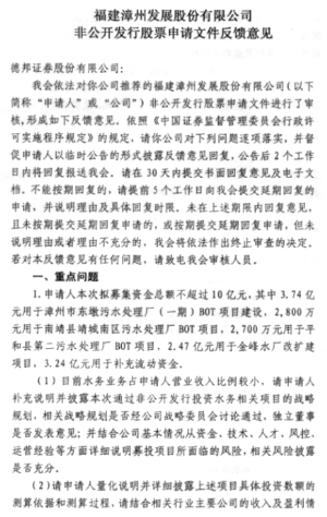 附:福建漳州发展股份有限公司非公开发行股票申请文件反馈意见