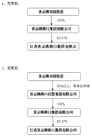 本次变更前连云港市国资委持有港口集团100%股权,是其控股股东;变更后,由连云港市人民政府授权组建的连云港港口控股集团有限公司(以下简称:港口控股集团)持有港口集团100%股权。详细情况请查阅2015年8月25日刊登在上海证券交易所网站、中国证券报、上海证券报、证券时报上的《关于组建连云港港口控股集团有限公司的提示性公告》(公告编号:临2015-033)。