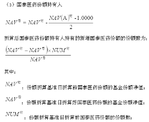 关于国泰国证医药卫生行业指数 分级证券投资基金 办理定期份额折算业务的公告 根据《国泰国证医药卫生行业指数分级证券投资基金基金合同》(简称“基金合同”),及深圳证券交易所和中国证券登记结算有限责任公司的相关业务规定,国泰国证医药卫生行业指数分级证券投资基金(简称“本基金”)将以2016年1月4日为基准日办理定期份额折算业务。相关事项提示如下: 一、基金份额折算基准日 根据基金合同的规定,定期份额折算基准日为每个会计年度(除基金合同生效日所在会计年度外)第一个工作日。本次定期份额折算的基准日为2016年1月4日。 二、基金份额折算对象 基金份额折算基准日登记在册的医药A份额(基金代码:150130,基金场内简称:医药A)和国泰医药份额(基金代码:160219,基金场内简称:国泰医药)。 三、基金份额折算方式 每个会计年度第一个工作日为基金份额折算基准日,本基金将在该日对医药A份额进行应得收益的定期份额折算,国泰医药份额的基金份额净值也相应的进行调整。在基金份额折算前与折算后,医药A份额和医药B份额的份额配比保持1:1的比例。 折算前的医药A份额持有人,以医药A份额在基金份额折算基准日的基金份额净值超出本金1.0000元部分,获得新增国泰医药份额的份额分配。折算不改变医药A份额持有人的资产净值,其持有的医药A份额的基金份额净值折算调整为1.0000元、份额数量不变,相应折算增加场内国泰医药份额。 折算前的国泰医药份额的基金份额持有人,以每2份国泰医药份额,按1份医药A份额的份额分配,获得新增国泰医药份额。持有场外国泰医药份额的基金份额持有人将按前述折算方式获得新增场外国泰医药份额的分配;持有场内国泰医药份额的基金份额持有人将按前述折算方式获得新增场内国泰医药份额的分配。折算不改变国泰医药份额持有人的资产净值。 折算不改变医药B份额持有人的资产净值,其持有的医药B份额的基金份额净值及份额数量不变。 按照上述折算方法,可能会给基金份额持有人的资产净值造成微小误差,视为未改变基金份额持有人的资产净值。 有关计算公式如下: ■ 医药A份额新增份额折算成国泰医药份额的场内份额取整计算(最小单位为1 份),不足1份的零碎份,按各个零碎份从大到小的排序,依次向相应的基金份额持有人记增1份,直到所有零碎份的合计份额分配完毕。 (2)医药B份额持有人 每个会计年度的定期份额折算不改变医药B份额的基金份额净值及其份额数。 ■ 国泰医药份额的场外份额经折算后的份额数采用截位法保留到小数点后两位,由此产生的误差计入基金财产;国泰医药份额的场内份额经折算后的份额数取整计算(最小单位为1 份),不足1份的零碎份,按各个零碎份从大到小的排序,依次向相应的基金份额持有人记增1份,直到所有零碎份的合计份额分配完毕。 四、基金份额折算期间的基金业务办理 1、定期份额折算基准日(即2016年1月4日),本基金暂停办理申购、赎回、转托管(包括场外转托管、跨系统转托管,下同)业务、配对转换业务;医药A、医药B正常交易。当日晚间,基金管理人计算当日基金份额净值及份额折算比例。 2、定期份额折算基准日后的第一个工作日(即2016年1月5日),本基金暂停办理申购、赎回、转托管、配对转换业务,医药A暂停交易、医药B正常交易。当日,本基金注册登记人及基金管理人为持有人办理份额登记确认。 3、定期份额折算基准日后的第二个工作日(即2016年1月6日),基金管理人将公告份额折算确认结果,持有人可以查询其账户内的基金份额。当日,本基金恢复办理申购、赎回、转托管、配对转换业务。医药A将于2016年1月6日上午9:30~10:30暂停交易一小时,并于当日10:30恢复交易,医药B正常交易。 五、重要提示 1、根据《深圳证券交易所证券投资基金交易和申购赎回实施细则》第十一条的规定,2016年1月6日医药A复牌首日即时行情显示的前收盘价为2016年1月5日的医药A的份额净值(四舍五入至0.001元)。由于医药A折算前可能存在折溢价交易情形,折算前的收盘价扣除2015年约定收益后与2016年1月6日的前收盘价可能有较大差异,1月6日当日可能出现交易价格大幅波动的情形,敬请投资者注意投资风险。 2、由于医药A份额表现为预期风险和预期收益较低的特征,当发生合同规定的定期份额折算时,折算前的医药A份额持有人,以医药A份额在基金份额折算基准日的基金份额净值超出本金1.0000元部分,获得新增国泰医药份额的份额分配。折算不改变医药A份额持有人的资产净值,其持有的医药A份额的基金份额净值折算调整为1.0000元、份额数量不变,相应折算增加场内国泰医药份额。因此,持有人的风险收益特征将发生一定的变化,由持有单一的较低风险收益特征份额变为同时持有较低风险收益特征的医药A份额与较高风险收益特征的国泰医药份额的情况。由于国泰医药份额为跟踪国证医药卫生行业指数的基础份额,其份额净值将随市场涨跌而变化,因此原医药A份额持有人预期收益的实现存在一定的不确定性,可能会承担因市场下跌而遭受损失的风险。请投资者认真阅读本基金的基金合同和招募说明书了解相关内容。 3、由于医药A份额新增份额折算成国泰医药基金份额的场内份额数和国泰医药基金份额的场内份额经折算后的份额数取整计算(最小单位为1份),不足1份的零碎