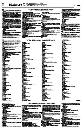 (上接B9版) 3、认购流程 (1)投资者通过网上交易系统、东方基金APP、东方基金微信服务号开立基金账户当日,即可使用开户证件号码或交易账号登录进行基金的认购业务。 (2)网上交易现开通支付银行:中国银行、中国工商银行、中国建设银行、中国农业银行、招商银行、广发银行、中国民生银行、浦发银行、交通银行、中国光大银行、华夏银行、平安银行、兴业银行、中信银行、上海银行借记卡以及汇付天下天天盈账户。 东方基金APP、东方基金微信服务号现开通支付银行:中国银行、中国工商银行、中国建设银行、中国农业银行、招商银行、中国民生银行、浦发银行、中国光大银行、华夏银行、平安银行、兴业银行、中信银行、上海银行借记卡。 在登录本公司网站(www.df5888.com或www.orient-fund.com)、东方基金APP、东方基金微信服务号,与本公司达成网上交易的相关协议,接受本公司有关服务条款并办理相关手续后方可认购。 (3)投资者通过本公司网上交易系统、东方基金APP、东方基金微信服务号认购本基金,具体交易细则请参阅本公司网站公告。 (4)已经成功提交的认购申请不得撤销。 4、缴款方式 通过本公司网上交易系统、东方基金APP、东方基金微信服务号认购的个人投资者需准备足额的认购资金存入其在本公司网上交易系统指定的资金结算账户,在提交认购申请时通过实时支付的方式缴款。 三、个人及机构投资者在各代销渠道办理开户与认购 个人及机构投资者在各代销渠道的开户及认购程序以各代销渠道的规定和说明为准。 四、清算与交割 1、基金合同生效前,全部认购资金将被冻结在本基金募集专户中,有效认购款项在募集期间产生的利息,在基金合同生效后折算为基金份额归基金份额持有人所有,利息以登记机构的记录为准。 认购资金利息计算结果保留小数点后两位,小数点后两位以后的部分舍去,由此误差产生的损失由基金财产承担,产生的收益归基金财产所有。 2、本基金权益登记由基金登记机构在募集结束后完成。 五、基金的验资与基金合同生效 1、基金募集期限届满,在基金募集份额总额不少于2亿份,基金募集金额不少于2亿元人民币,并且基金份额持有人的人数不少于200人的条件下,基金管理人应当自募集期限届满之日起10日内聘请法定验资机构验资,自收到验资报告之日起10日内,向中国证监会提交验资报告,办理基金备案手续。自中国证监会书面确认之日起,基金备案手续办理完毕,基金合同生效。 2、基金管理人在收到中国证监会确认文件的次日对基金合同生效事宜予以公告。 3、本基金合同生效前,投资人的认购款项只能存入专用账户,任何人不得动用。认购资金在募集期形成的利息在本基金合同生效后折成投资人认购的基金份额,归投资人所有。利息转份额的具体数额以登记机构的记录为准。 4、如基金募集失败,基金管理人应以其固有财产承担因募集行为而产生的债务和费用,在基金募集期限届满后30日内返还投资人已缴纳的款项,并加计银行同期存款利息。 六、本次份额发售当事人和中介机构 (一)基金管理人 名称:东方基金管理有限责任公司 住所:北京市西城区锦什坊街28号1-4层 办公地址:北京市西城区锦什坊街28号1-4层 法定代表人:崔伟 电话:010-66295888 传真:010-66295999 联系人:李景岩 客户服务电话:400-628-5888 网址:www.df5888.com或www.orient-fund.com (二)基金托管人 名称:中国民生银行股份有限公司 办公地址:北京市西城区复兴门内大街2号 法定代表人:洪崎 联系人:罗菲菲 联系电话:010-58560666 (三)直销机构 1、柜台交易 名称:东方基金管理有限责任公司 住所:北京市西城区锦什坊街28号1-4层 办公地址:北京市西城区锦什坊街28号3层 法定代表人:崔伟 联系人: 孙桂东 电话:010-66295921 传真:010-66578690 网站:www.orient-fund.com或www.df5888.com 2、电子交易 投资者可以通过本公司网上交易系统办理基金的认购、申购、赎回等业务,具体业务办理情况及业务规则请登录本公司网站查询。 本公司网址:www.orient-fund.com / www.df5888.com (四)其他销售机构 1、中国民生银行股份有限公司 住所:北京市西城区复兴门内大街2号 办公地址:北京市西城区复兴门内大街2号 法定代表人:洪崎 联系人:刘健 电话:010-57092637 传真:010-57092611 客户服务电话:95568 网址:www.cmbc.com.cn 2、中国邮政储蓄银行股份有限公司 住所:北京市西城区金融大街3号 办公地址:北京市西城区金融大街3号 法定代表人:李国华 联系人:王硕 传真:010-68858117 客户服务电话:95580 网址:www.psbc.com 3、兴业银行股份有限公司 住所:福州市湖东路154号 办公地址:上海市江宁路168号兴业大厦9楼 法定代表人:高建平 联系人:刘玲 电话:021-52629999 传真:021-62569070 客户服务电话:95561 网址:www.cib.com.cn 4、吉林银行股份有限公司 住所:吉林省长春市东南湖大路1817号 办公地址:吉林省长春市东南湖大路1817号 法定代表人:唐国兴 联系人:孟明 电话:0431-84992680 传真:0431-84992649 客户服务电话: 400-88-96666(全国)、96666(吉林省) 网址:www.jlbank.com.cn 5、长江证券股份有限公司 住所:武汉市新华路特8号长江证券大厦 办公地址:武汉市新华路特8号长江证券大厦 法定代表人:杨泽柱 联系人:奚博宇 电话:027-65799999 传真:027-85481900 客户服务电话:95579或4008-888-999 网址:www.95579.com 6、东北证券股份有限公司 住所:长春市自由大路1138号 办公