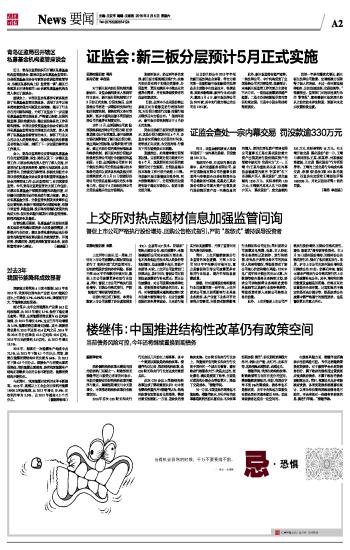 证监会:新三板分层预计5月正式实施