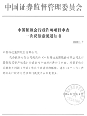 附:中国证监会行政许可项目审查一次反馈意见通知书(160333号)