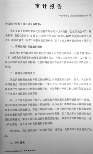 1.重要提示 1.1本公司董事会及董事保证本报告所载资料不存在任何虚假记载、误导性陈述或者重大遗漏,并对其内容的真实性、准确性和完整性承担个别及连带责任。 1.2公司独立董事齐逢昌先生、田忠华先生、刘纪鹏先生声明:保证本年度报告内容的真实性、准确性和完整性。 1.3公司董事长卢志强先生、总裁张博先生、首席财务官赵东先生声明:保证本年度报告中财务报告的真实、完整。 2.公司概况 2.1 公司简介 2.1.1 公司的法定名称 中文:中国民生信托有限公司(简称:中国民生信托) 英文:China MinSheng Trust Co., Ltd.(缩写:CMT) 2.1.2 公司法定代表人:卢志强 2.1.3 公司注册地址:北京市东城区建国门内大街28号民生金融中心C座19层 邮政编码:100005 公司网址: www.msxt.com 公司电子信箱:minshengtrust@msxt.com 2.1.4 公司负责信息披露事务的高级管理人员:董事会秘书 李永平 公司信息披露事务联系人:吴斌 办公电话:8610-85259071 办公传真:8610-85259080 电子信箱:wubin@msxt.com 2.1.5 公司选定的信息披露报纸:金融时报、证券时报 2.1.6公司年度报告备置地点:公司董事会办公室 2.1.7公司聘请的会计师事务所:中兴华会计师事务所(特殊普通合伙) 住所:北京市西城区阜外大街1号东塔楼15层 2.2 公司组织结构 ■