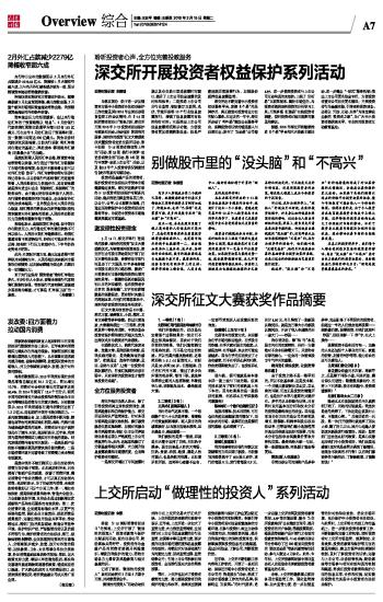 为落实国办《关于进一步加强资本市场中小投资者合法权益保护工作的意见》和2016年全国证券期货监管工作会议精神,在“3·15国际消费者权益日”到来之际,深交所开展2016年3·15投资者权益保护专题系列活动。活动包括“述说我的股事,理性你的投资”征文大赛颁奖仪式暨投资者走进交易所活动、第十四届“3·15投资者维权网上咨询”活动、第25期“践行中国梦·走进券商营业部”活动、第160期“践行中国梦·走进上市公司”活动,以及《2015年个人投资者状况调查报告》发布等系列专题活动。 投资者是金融产品的消费者,保护投资者合法权益关乎资本市场健康稳定发展。深交所连续多年举办3·15投资者权益保护专题系列活动,稳步推进自律监管各项工作,以公开、公平、公正原则为准绳,打造全面持续保护中小投资者权益的服务平台,为促进中国资本市场稳健发展奠定牢固基础。 激发理性投资理念 3月14日,深交所举行“述说我的股事,理性你的投资”征文大赛颁奖仪式。为培育理性投资理念,深交所在去年股市异动期间开展了征文大赛作品征集,参赛作品字里行间见证了广大股民20年多来伴随中国股市成长的心路历程,激发广大投资者对市场风险和投资决策的理性思考。一篇篇作品既有新股民初入市的兴奋感受,也有投资老手分享的“股林秘籍”,文字间有群情激荡的高歌猛进,更有暂时失意后的深刻反思,在他们的喜怒哀乐中,理性和价值投资的理念生根发芽。 征文大赛共收到作品610篇,形式丰富,涵盖散文、小说、剧本、文言文诗歌等多种体裁。经过三重选拔,大赛最终颁出一二三等奖、优秀奖及若干特色单项奖,中国证监会投资者保护局和深交所相关负责人出席仪式并为获奖者代表颁奖。 在颁奖仪式上,获奖代表发言称,“这篇文章,是我经验的浓缩,是我实践的验证,是我最真诚的感悟”,希望通过“这些年的探索、见证、总结与反思”,让每一位投资者朋友都明白,“在变幻莫测的证券市场中,只有理性的投资理念才能带来投资的乐趣”。 全方位服务投资者 深交所相关负责人表示,除了引导投资者树立理性投资理念、提高风险意识和自我保护能力,深交所还坚持从严监管理念,针对各项市场风险完善长效机制。修订融资融券交易实施细则,加强对两融业务的风险管理;制定《上市公司停复牌业务备忘录》,严格规范上市公司停复牌行为。此外,还起草和修订了分级基金等相关规则,大力提升信息披露质量和市场透明度,全面维护投资者知情权。 一是深交所增加了早间披露时段以及非交易日直通披露时间窗口,提升了上市公司信息披露的及时性和效率;二是推进上市公司分行业监管,制定修订互联网、光伏、节能环保等10个行业信息披露指引,增强了信息披露的有效性和针对性;三是推出上市公司信息披露简明展示功能,方便投资者更加便捷获取信息;四是严查违规买卖股票行为,加强股份质押信息披露监管。 深交所还不断完善中小投资者权益服务平台,发挥“6个易”的品牌作用,真正做到对投资者全方位的贴心服务。在过去的一年中,深交所启动了“呼叫易”微信公众服务平台,保障投资者诉求的畅通接入与迅速回应;发布了“互动易”公司端APP,进一步提高投资者与上市公司互动沟通的实效性;上线了“分析易”互联网版本,填补市场空白,为投资者提供理性投资的分析学习工具;开展多场“征集易”在线投资者调查,倾听投资者对相关规则的意见和建议。 据悉,2016年深交所将继续推进“6个易”平台和三大投教主题活动,进一步健全“一站式”服务机制;推出上市公司更名信息专栏,方便投资者查询公司历史更名情况;开展投资者行为金融实验,引导理性投资理念;还将以“开放、互动、共享”为理念建设全新的“投资者之家”,为广大中小投资者提供高水平、专业性的投资者互动教育基地。 本版导读: