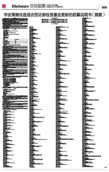 重要提示 华安策略优选混合型证券投资基金由安久证券投资基金转型而成。依据中国证监会2007年7月23日证监基金字【2007】210号文核准的安久证券投资基金基金份额持有人大会决议,安久证券投资基金由封闭式基金转为开放式基金、调整存续期限、终止上市、调整投资目标、范围和策略、修订基金合同,并更名为“华安策略优选股票型证券投资基金”。自2007年8月2日起,由《安久证券投资基金基金合同》修订而成的《华安策略优选股票型证券投资基金基金合同》生效。根据《公开募集证券投资基金运作管理办法》及基金合同的有关约定,经协商基金托管人同意,并报中国证监会备案,自2015年8月6日起,华安策略优选股票型证券投资基金更名为 “华安策略优选混合型证券投资基金”,其对应基金简称更名为“华安策略优选混合”。 基金管理人保证本招募说明书的内容真实、准确、完整。本招募说明书经中国证监会核准,但中国证监会对本基金募集的核准,并不表明其对本基金的价值和收益作出实质性判断或保证,也不表明投资于本基金没有风险。 本基金投资于证券市场,基金净值会因为证券市场波动等因素产生波动,投资者在投资本基金前,需充分了解本基金的产品特性,并承担基金投资中出现的各类风险,包括:因整体政治、经济、社会等环境因素对证券价格产生影响而形成的系统性风险,个别证券特有的非系统性风险,由于基金投资人连续大量赎回基金产生的流动性风险,基金管理人在基金管理实施过程中产生的基金管理风险,本基金的特定风险,等等。投资者在进行投资决策前,请仔细阅读本基金的《招募说明书》及《基金合同》。 基金的过往业绩并不预示其未来表现。 本摘要根据本基金的基金合同和招募说明书编写,并经中国证监会核准。基金合同是约定基金当事人之间权利、义务的法律文件。基金投资人自依基金合同取得基金份额,即成为基金份额持有人和本基金合同的当事人,其持有基金份额的行为本身即表明其对基金合同的承认和接受,并按照《基金法》、《运作办法》、基金合同及其他有关规定享有权利、承担义务。基金投资人欲了解基金份额持有人的权利和义务,应详细查阅基金合同。 基金管理人依照恪尽职守、诚实信用、谨慎勤勉的原则管理和运用基金财产,但不保证基金一定盈利,也不保证最低收益。 本招募说明书摘要已经本基金托管人复核。除特别说明外,本招募说明书摘要所载内容截止日为2016年2月2日,有关财务数据和净值表现截止日为2015年12月31日。 一、基金管理人 (一)基金管理人概况 1、名称:华安基金管理有限公司 2、住所:中国(上海)自由贸易试验区世纪大道8号上海国金中心二期31-32层 3、法定代表人:朱学华 4、设立日期:1998年6月4日 5、批准设立机关及批准设立文号:中国证监会证监基字[1998]20号 6、注册资本:1.5亿元人民币 7、组织形式:有限责任公司 8、经营范围:从事基金管理业务、发起设立基金以及从事中国证监会批准的其他业务 9、存续期间:持续经营 10、联系电话:(021)38969999 11、客户服务电话:40088-50099 12、联系人:王艳 13、网址:www.huaan.com.cn (二)注册资本和股权结构 1、注册资本:1.5亿元人民币 2、股权结构 ■ (三)主要人员情况 1、基金管理人董事、监事、经理及其他高级管理人员的姓名、从业简历、学历及兼职情况等。 (1)董事会 朱学华先生,大专学历。历任上海证券有限责任公司党委书记、副董事长、副总经理并兼任海际大和证券有限责任公司董事长,现任华安基金管理有限公司董事长、法定代表人,党总支书记。 童威先生,博士研究生学历,14年证券、基金从业经验。曾任上海证券有限责任公司研究发展中心部门总经理,上海国际集团有限公司研究发展总部副总经理(主持工作),上投摩根基金管理有限责任公司副总经理,上海国际集团有限公司战略发展总部总经理,自2015年7月起任华安基金管理有限公司总经理。 冯祖新先生,研究生学历。历任上海市经济委员会信息中心副主任、主任,上海市工业投资公司副总经理、总经理,上海工业投资(集团)有限公司副总裁、党委副书记,执行董事(法定代表人)、总裁、党委书记。 马名驹先生,工商管理硕士,高级会计师。历任凤凰股份有限公司副董事长、总经理,上海东方上市企业博览中心副总经理。现任锦江国际(集团)有限公司副总裁兼计划财务部经理及金融事业部总经理、上海锦江国际投资管理有限公司董事长兼总经理、锦江麦德龙现购自运有限公司副董事长、长江养老保险股份有限公司董事、史带财产保险股份有限公司监事、上海国际信托有限公司监事。 董鑑华先生,大学学历,高级经济师。历任上海市审计局固定资产投资科员、副处长、处长,上海市审计局财政审计处处长,现任上海电气(集团)总公司财务总监。 王松先生,研究生学历,高级经济师。历任建设银行总行投资部职员,国泰证券有限公司北京办事处副主任、发行二部副总经理、债券部总经理,国泰君安证券股份有限公司债券业务一部总经理、固定收益证券总部总经理、固定收益证券总部总监、总裁助理、副总裁,现任国泰君安证券股份有限公司总裁。 独立董事: 萧灼基先生,研究生学历,教授。历任全国政协委员,政协经济委员会委员,北京大学经济学院教授,博士生导师,北京市、云南省、吉林