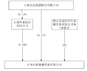 证券代码:000807 证券简称:云铝股份 公告编号:2016—013 云南铝业股份有限公司关于控股子公司 云南文山铝业有限公司为控股子公司 云南云铝涌鑫铝业有限公司融资提供 连带责任担保的公告 本公司及董事会全体成员保证公告内容的真实、准确和完整,没有虚假记载、误导性陈述或者重大遗漏。 重要内容提示: 1.被担保人:云南云铝涌鑫铝业有限公司。 2.本次担保金额:合计总额不超过4亿元(含4亿元)人民币。 3.该事项需提交公司下一次股东大会审议。 一、担保情况概述 云南铝业股份有限公司(以下简称“云铝股份”或“公司”)控股子公司云南云铝涌鑫铝业有限公司(以下简称“涌鑫公司”)为满足生产经营需求,将向金融机构申请综合授信不超过人民币4亿元(含4亿元),期限不超过1年(含1年)的借款融资。公司控股子公司云南文山铝业有限公司(以下简称“文山公司”)为涌鑫公司综合授信的借款融资承担金额不超过4亿元(含4亿元)人民币,担保期限不超过1年(含1年)的连带责任担保。涌鑫公司为文山公司提供金额不超过4亿元(含4亿元)人民币的反担保。 2016年3月18日,公司以通讯方式召开第六届董事会第二十五次会议,以8票同意、0票反对、0票弃权的表决结果审议通过了《关于控股子公司云南文山铝业有限公司为控股子公司云南云铝涌鑫铝业有限公司融资提供连带责任担保的预案》,由于该事项涉及关联交易事项,审议时关联董事田永、丁吉林、何伟回避表决。根据中国证监会、银监会《关于规范上市公司对外担保行为的通知》和《公司章程》规定,该事项将提交公司下一次股东大会审议。 二、 担保各方基本情况 (一)被担保方基本情况 公司名称:云南云铝涌鑫铝业有限公司 成立日期:2005年6月30日 注册地点:云南省红河哈尼族彝族自治州建水县羊街工业园区 法定代表人:张春生 注册资本:10.35亿元 实收资本:10.35亿元 主营业务:重熔用铝锭及铝加工制品销售 涌鑫公司出资比例如下: ■ 截至2014年12月31日,涌鑫公司总资产为45.05亿元,净资产6.79亿元,负债总额为38.26亿元(其中流动负债为25.25亿元,非流动负债为13.01亿元;流动负债中短期借款为8.70亿元,一年内到期的非流动负债为2.76亿元;非流动负债中长期借款为8.93亿元)。2014年涌鑫公司实现营业收入41.65亿元,利润总额为-2.59亿元,净利润为-2.22亿元。 截至2015年9月30日,涌鑫公司总资产为44.82亿元,净资产5.07亿元,负债总额为39.75亿元(其中流动负债为27.69亿元,非流动负债为12.06亿元;流动负债中短期借款为4.20亿元,一年内到期的非流动负债为3.88亿元;非流动负债中长期借款为7.03亿元)。2015年1-9月年涌鑫公司实现营业收入29.27亿元,利润总额为-2.01亿元,净利润为-1.74亿元。 (二)担保方基本情况 公司名称:云南文山铝业有限公司 成立日期:2004年4月16日 注册资本:18亿元 法定代表人:丁吉林 主营业务:铝土矿资源开发、开采;氢氧化铝、氧化铝及其延伸产品的生产加工和销售;液氧、液氮、硫磺、硫酸铵、铁精矿、金属镓、蒸汽和赤泥的生产和销售。 文山公司出资比例如下: ■ 截至2014年12月31日,文山公司总资产为63.93亿元,净资产19.69亿元,负债总额为44.24亿元(其中流动负债为25.21亿元,非流动负为19.03亿元;流动负债中短期借款为9.19亿元,一年内到期的非流动负债为6.41亿元;非流动负债中长期借款为11.41亿元)。2014年文山公司实现营业收入19.20亿元,利润总额为1.17亿元,净利润为0.98亿元。 截至2015年9月30日,文山公司总资产为64.36亿元,净资产21.21亿元,负债总额为43.15亿元(其中流动负债为27.24亿元,非流动负债为15.91亿元;流动负债中短期借款为7.07亿元,一年内到期的非流动负债为8.82亿元;非流动负债中长期借款为10.58亿元)。2015年1-9月年文山公司实现营业收入14.71亿元,利润总额为1.48亿元,净利润为1.24亿元。 三、关联方基本情况 1.冶金集团的基本情况 公司名称:云南冶金集团股份有限公司 成立日期:1990年10月19日 公司住所:云南省昆明市北市区小康大道399号 法定代表人:田永 注册资本:1,061,303万元(人民币) 经营范围:矿产品、冶金产品、副产品、延伸产品。承包境外有色冶金工程和境外国际招标工程,承包上述境外工程的勘察、咨询、设计和监理项目;上述境外工程所需的设备、材料进口;对外派遣实施上述境外工程所需的劳务人员;冶金技术开发、转让及培训;冶金生产建设所需材料及设备的经营;仪器仪表检测及技术服务。 冶金集团目前的股权结构如下表: ■ 2.关联关系 冶金集团占公司股本的49.13%,为公司的控股股东。同时,持有涌鑫公司股权比例为43.21% ,持有文山公司股权比例为5%,文山公司为涌鑫公司提供担保事项构成关联交易。 3.主要财务情况 冶金集团最近一年及一期主要财务指标情况如下表: ■ 四、担保协议的主要内容 目前双方未签订担保协议,待公司下一次股东大会审议通过后签署担保协议。 五、与该关联人累计已发生的各类关联交易的总金额 2015年年初至2015年9月30日与冶金集团累计已发生的各类关联交易的总金额为461,091,193.41元。 六、董事会意见 (一)董事会意见 1.涌鑫公司向金融机构申请授信融资,按照金融机构要求均需要相关方提供担保,因此由公司控股子公司文山公司为其综合授信借款融资提供担保。 2.涌鑫公司、文山公司是公司的控股子公司,公司能够有效控制子公司的财务和经营决策,担保风险是