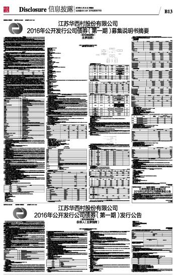 股票简称:华西股份 股票代码:000936 公告编号:2016-024 江苏华西村股份有限公司2016年公开发行公司债券(第一期)募集说明书摘要 2016-03-24 来源:证券时报网 作者: