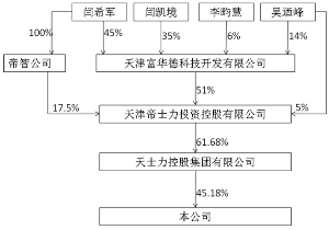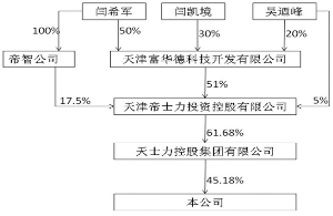 股权变动后:■ 本次股权转让前,闫希军先生是上市公司的实际控制人,本次股权转让完成后,闫希军先生、闫凯境先生、吴迺峰女士、李畇慧女士共同成为上市公司实际控制人。 二、本次交易相关股权转让协议的主要内容 1、股权转让协议的主要内容 (1)当事人:出让人:闫希军、吴迺峰 受让人:闫凯境,李畇慧 (2)转让股权比例:闫希军转让其持有的富华德5%股权给闫凯境,吴迺峰转让其持有的富华德6%股权给李畇慧。 (3)股权性质及性质变动情况:转让的股权为有限责任公司股权,非国有股股权,不存在股权性质变动的情况。 (4)转让价款:闫希军转让给闫凯境的5%股权转让价款为180万元。吴迺峰转让给李畇慧的6%股权转让价款为216万元。 (5)股权转让的支付对价和付款安排:本次股权转让采用现金支付方式,于股权转让协议生效后30日内支付。 (6)协议签订时间、生效时间:签订时间:2016年3月27日;生效时间:2016年3月27日;生效条件:自合同双方签字盖章之日起生效。 三、本次收购的授权或批准情况 1、2016年3月27日,富华德公司经股东会审议通过,同意闫希军先生将其所持有的5%股权转让给闫凯境先生,吴迺峰女士将其持有的6%股权转让给李畇慧女士。 2、2016年3月27日,相关各方签署了《天津富华德科技开发有限公司股权转让协议》。 第五节前6个月内买卖上市交易股份的情况 一、信息披露义务人在权益变动事实发生日之前6个月买卖上市公司股票的情况 自2015年9月27日至2016年3月27日期间,信息披露义务人不存在买卖上市公司股票的行为。 第六节资金来源 一、收购资金金额及支付方式 本次股权转让,吴迺峰转让给李畇慧富华德6%股权的对价为216万元,均采用现金支付的方式。 二、本人关于收购资金来源的声明 受让方李畇慧已承诺其将严格按照相关法律法规的规定自筹资金,用于支付本次购买富华德股权的价款。 第七节后续计划 一、上市公司主营业务调整计划 截至本报告书签署日,本人尚无对上市公司主营业务调整的计划。 二、本次股权转让完成后对上市公司或其子公司的重组计划 截至本报告书签署日,本人尚无对上市公司或其子公司的资产和业务进行出售、合并、与他人合资或合作的计划,或上市公司的其他重大资产重组计划。 三、上市公司董事、监事及高级管理人员的变动计划 本次权益变动完成后,本人尚无对上市公司董事、监事及高级管理人员的变动计划 四、章程修改计划 本次股份权益变动属于间接收购,截至本报告书签署之日,上市公司章程中不存在阻碍本人通过间接协议受让方式控制上市公司股权的条款,本人亦未有修改上市公司章程的计划。 五、员工聘任计划 截至本报告书出具之日,本人没有对上市公司现有员工聘用计划作重大变动的计划。 六、分红政策计划 截至本报告书出具之日,本人没有调整上市公司现行分红政策的计划。 七、其他有重大影响的计划 截至本报告书出具之日,除本报告书中披露的本次权益变动相关事宜外,本人没有其他对上市公司的业务和组织结构有重大影响的计划。 第八节对上市公司的影响分析 一、本次收购对上市公司独立性的影响 1、资产独立 本次交易完成后,上市公司对其所有的资产拥有完整、独立的所有权。上市公司完全独立经营。本人保证上市公司不存在资金、资产被本人占用的情形。 2、人员独立 本人保证上市公司继续拥有独立完整的劳动、人事及工资管理体系,该等体系完全独立。本人向上市公司推荐董事、监事、经理等高级人员人选均通过合法程序进行,不干预上市公司董事会和股东大会行使职权做出人事任免决定。上市公司的总经理、副总经理、财务负责人、董事会秘书等高级管理人员均专职在上市公司工作,并在上市公司领取薪酬,不在本人及其关联企业担任除董事之外的其他职务。 3、财务独立 本人保证,上市公司继续拥有独立的财务部门和独立的财务核算体系;上市公司具有规范、独立的财务会计制度;上市公司独立在银行开户,不与本人共用一个银行账户;上市公司的财务人员不在本人及本人控制的公司兼职;上市公司依法独立纳税;上市公司能够独立做出财务决策,本人不干预上市公司的资金使用。 4、机构独立 本人保证上市公司将继续保持健全的股份公司法人治理结构,拥有独立、完整的组织结构;上市公司的股东大会、董事会、独立董事、监事会、总经理等依照法律、法规和公司章程独立行使职权。 5、业务独立 上市公司继续拥有独立的经营管理系统,有独立开展经营业务的资产、人员、资质和能力,具有面向市场独立自主持续经营的能力。本人除依法行使股东权利外,不会对上市公司的正常经营活动进行干预。 二、同业竞争和关联交易 1、避免同业竞争的的承诺 本次交易前,本人未与上市公司从事存在同业竞争的业务,为避免将来出现的同业竞争,本人承诺:(1)本人及本人控制的附属企业将不在中国境内新增加或以任何方式(包括但不限于由其单独经营、通过合资经营、或与另一公司或企业拥有股份或者其他权益)参与任何与天士力及其子公司业务相同或者类似的业务及其他构成或可能构成竞争之任何业务活动,以避免本人及本人其他控股、附属公司与天士力及其子公司的生产经营构成业务竞争。(2)本人将不会利用对天士力的控制地位从事任何损害天士力或天士力其