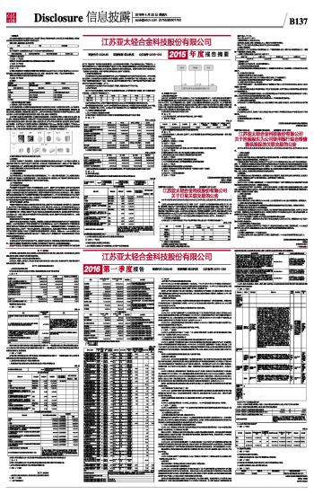 江苏亚太轻合金科技股份有限公司2015年度报告摘要 2016-04-23 来源:证券时报网 作者: